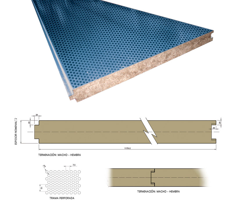 Paneles sándwich con núcleo en lana de roca y dos caras de acero, una de las cuales está perforada para conseguir altos valores de reducción y absorción acústica. Los paneles acústicos de Kingspan | invespanel están disponibles en diferentes espesores y patrones de perforado para cumplir con los requisitos de cada tipo de instalación.